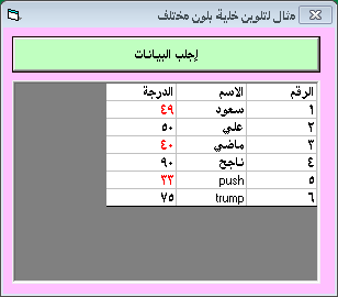 أهلا بك أخي الكريم , أعتقد لايمكنك عمل ماتريد بواسطة هذه الاداة لأنها لاتدعم ذلك حتى وإن دعمت لابد من عمل كود يقوم بذلك بعد إكتمال تحميل البيانات في الأداة ومن ثم عمل حلقة تكرارية لتلوين الخلايا التي تريد كما حيث لايوجد حدث تستطيع من خلاله تغيير خصائص الخلايا أثناء تحميل البيانات في الأداة , يمكنك إستخدام أداة الفليكس قريد كما وضح ذلك مشكورا الأخ سعود في رده .