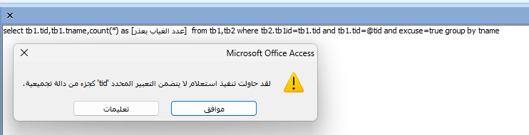 SELECT tb1.tid, tb1.tname, count(*) AS [عدد الغياب بعذر]