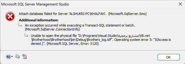حاولت أعمل Attach لملف قاعدة البيانات في برنامج SQL Server