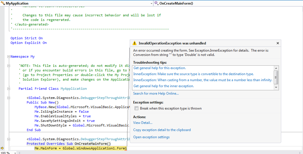 amgadtamer كتب :الخطأ له علاقه بالرساله وهو واضح فى الرساله أنك تريد تحويل "" الى double عليك بمراجعة الاكواد فى form1 فقد يحدث أنك تعتمد على قيمه من عنصر معين قبل إنشاءه وهذا هو سبب الخطأ