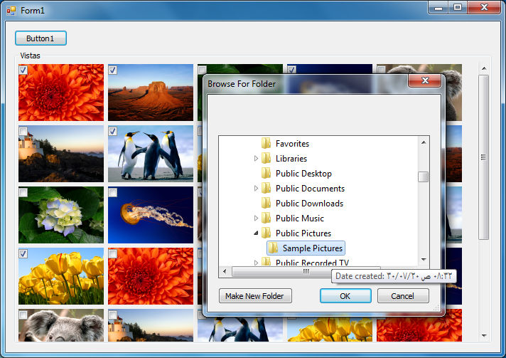لعمل مثال يشبة هذه الصورة 1: ادرج الأداة GroupBox واكتب في خاصية Text النص Vistas 2: ادرج الأداة FlowLayoutPanel واسحبها إلى داخل الآداة GroupBox واجعل الخاصية Dock تكون Fill والخاصية AutoScroll تكون True 3: أدرج الأداة Botton 4: أدرج الأداة FolderBrowserDialog لاستعراض المجلدات من أجل اختيار المجلد المطلوب اخذ الصور منه. 5: ضع هذا الكود كود : Public Class Form1قائمة CheckBox سوف تكون في المصفوفة CheckBoxImages يعني تقدر تعرف عدد الصور من CheckBoxImages.Count وتقدر تعرف هل الصورة تم تحديدها من CheckBoxImages(6).Checked هذه النتيجة