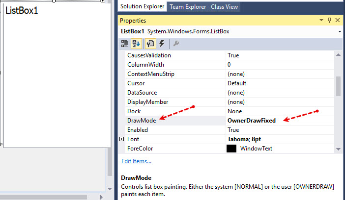 * اختر لخاصية DrowMode الاختيار التالي : OwnerDrawFixed