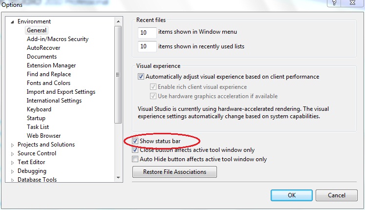 نصبت نسخة الفيجوال بيسك 2010 البروفيشنال ، لا يظهر فيها شريط المعلومات السفلي ، يعني مفروض لما أقوم بعمل Build يظهر التالي في الشريط المعلومات انظر الصورة للمحدد بالمستطيل الأصفر :